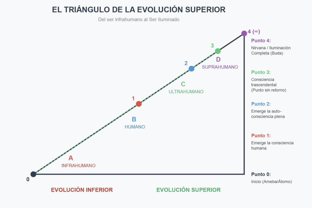 La sección desde el punto 0 hasta el punto 2 representa la evolución inferior—el camino que ya hemos recorrido. Es el dominio de la ciencia, especialmente de la biología. Desde el punto 2 en adelante se encuentra la evolución superior—el camino que aún nos queda por recorrer. Este es el territorio de la psicología avanzada, las artes, la religión en su sentido genuinamente espiritual, y lo que algunos llaman las ciencias «metabiológicas»—aquellas que van más allá del marco biológico ordinario.